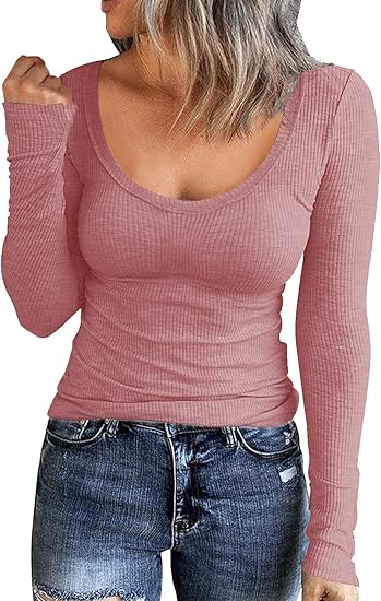 Women Long Sleeve Scoop Neck Ribbed Fitted Knit Shirt Basic T-Shirts