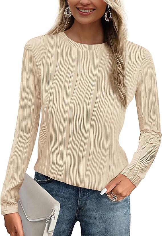 Women's Basic Plain Tee Shirts Fall Long Sleeve Crewneck Textured Dressy Casual Blouse Tops