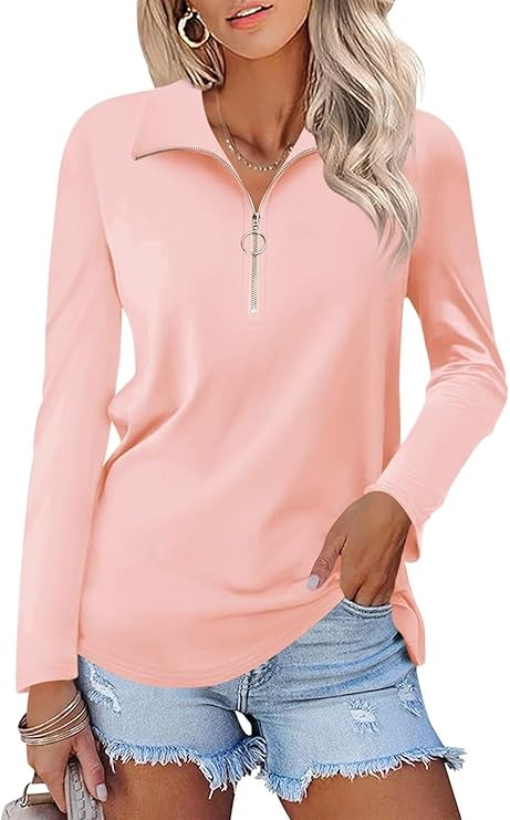 Women's Long Sleeve Shirts Quarter Zip Pullover Collared V Neck Tops Fall Blouses