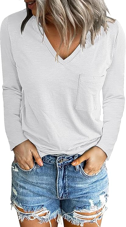 Women's V Neck Long Sleeve T Shirts Side Split Tunic Tops with Pocket Loose Fit Casual Basic Tees Shirts