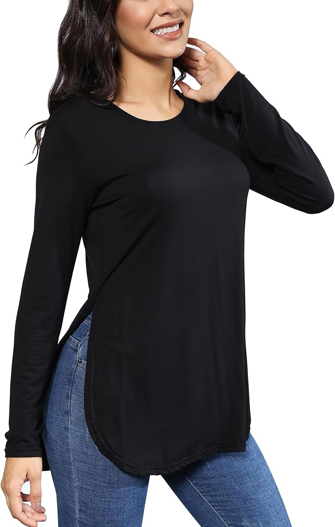 Womens T Shirts Casual Basic Crew Neck Tees Short/Long Sleeve Tunic Tshirt Tops with Side Split Slit