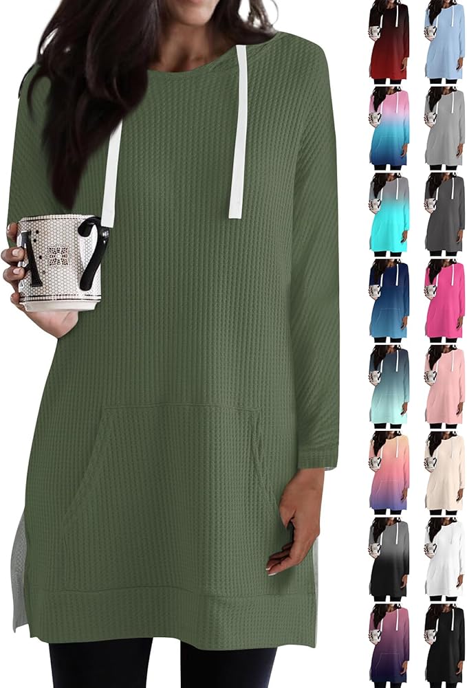Womens Tunic Tops Hooded Waffle Knit Tops Drawstring Long Sleeve Shirts Casual Split Hem Fall Hoodies with Pockets